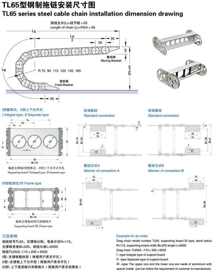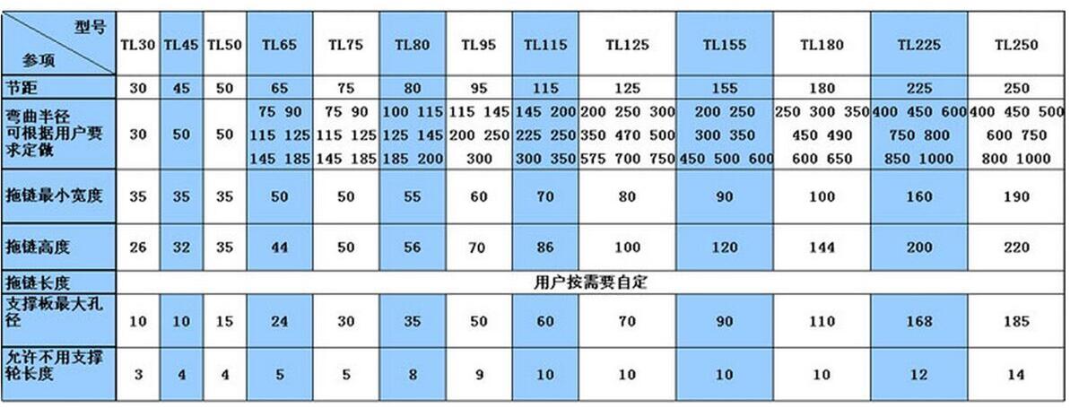 有TL45、TL65、TL95、TL125、TL180、TL225、TL250型,拖鏈寬度可按用戶要求定做,彎曲半徑從50-800之間。